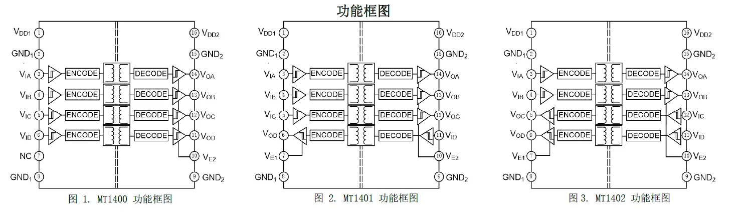 四通道數字隔離器--航天民芯MT1400/MT1401/MT1402(簡稱MT140x) 是采用磁隔離技術的4 通道數字隔離器,該產品結合了高速CMOS 與單片空芯變壓器技術,具有出色的優于光耦隔離器件的性能。通過避免使用發光二極管和光敏二極管,磁隔離設備避免了與光耦隔離器有關的設計困難。利用簡單的磁隔離數字接口和穩定的性能,消除了關于不確定的電流轉移比率,非線性轉移函數以及溫度和壽命影響等典型光耦隔離器的問題。磁隔離產品不需要外部驅動和分立器件。此外, 在較高的數據速率下,其功耗僅為光耦隔離器的十分之一至六分之一。