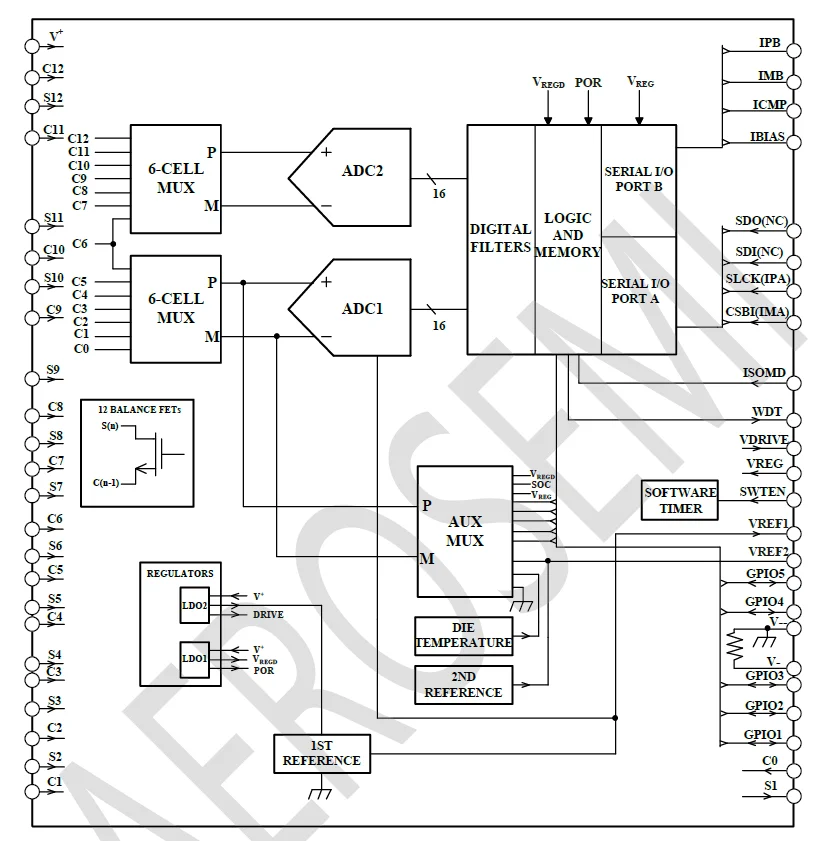 本芯片可測(cè)量多達(dá)12節(jié)串聯(lián)電池的電壓并具有低于1.2mV的總測(cè)量誤差。0V和5V的電池測(cè)量范圍使芯片成為大多數(shù)化學(xué)組成分電池的合適之選。所有12節(jié)電池的電壓可在290μs之內(nèi)完成,并可選擇較低的數(shù)據(jù)采集速率以實(shí)現(xiàn)高的噪聲抑制。另可將多個(gè)芯片串聯(lián)起來(lái),因而能在一長(zhǎng)串的高電壓電池中實(shí)現(xiàn)每節(jié)電池的同時(shí)監(jiān)視。每個(gè)芯片具有一個(gè)iso SPI接口,用于高速、抗RF干擾的局域通信。多個(gè)芯片采用菊鏈?zhǔn)竭B接,且所有器件采用一根主處理器接線。其他特點(diǎn)包括每節(jié)電池電荷的被動(dòng)平衡,一個(gè)內(nèi)置的5V穩(wěn)壓器和5根通用的I/O線芯片具有五種操作模式:硬件停機(jī)、睡眠、待機(jī)、基準(zhǔn)上電和測(cè)量模式。硬件停機(jī)是一種真正的零功率模式。在睡眠模式下,電流消耗減小至5μA。待機(jī)模式是一種省電狀態(tài)(除了串行接口之外其他電路全部關(guān)斷)。在測(cè)量模式中,用于測(cè)量電池電壓并把測(cè)量結(jié)果保存于存儲(chǔ)器中。另外,測(cè)量模式還將監(jiān)視每節(jié)電池的過(guò)壓(OV)及欠壓(UV)狀況。芯片的內(nèi)部結(jié)構(gòu)框圖如下圖所示: |